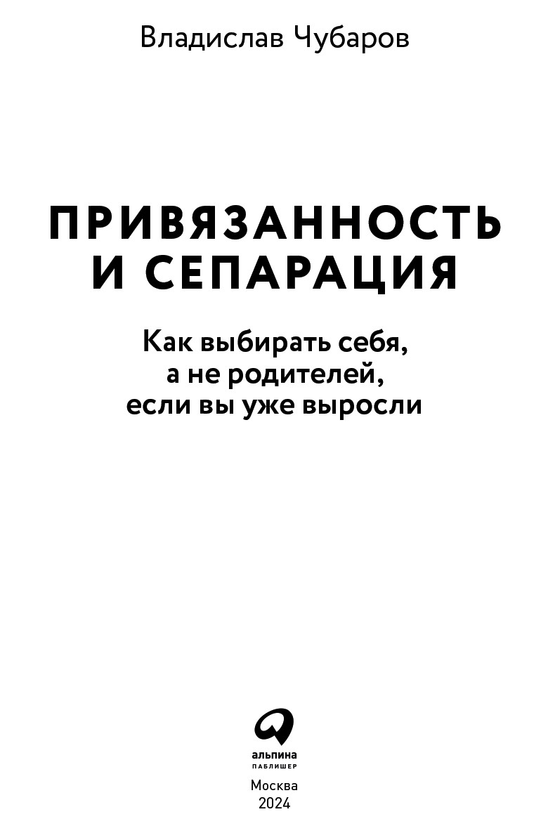 Моя книга, возможно, окажется для вас полезной – независимо от того, хорошие у вас отношения с родителями, плохие или вы совсем с ними не общаетесь. Ведь привязанность работает не только между вами, но и внутри вас. Она – мощный фактор нашего счастья или несчастья (а иногда – «и»). От того, как устроена наша привязанность, зависит наш способ строить отношения, не только с партнером, но и с друзьями, работой и многими другими важными вещами. Проблемы с привязанностью и сепарацией заставляют людей годами терпеть самодура-начальника или не дают решиться и переехать в другую страну. Мы вместе разберемся, как «применять» привязанность, когда она полезна, и как нейтрализовать ее влияние, когда она травмирует и наносит вред.