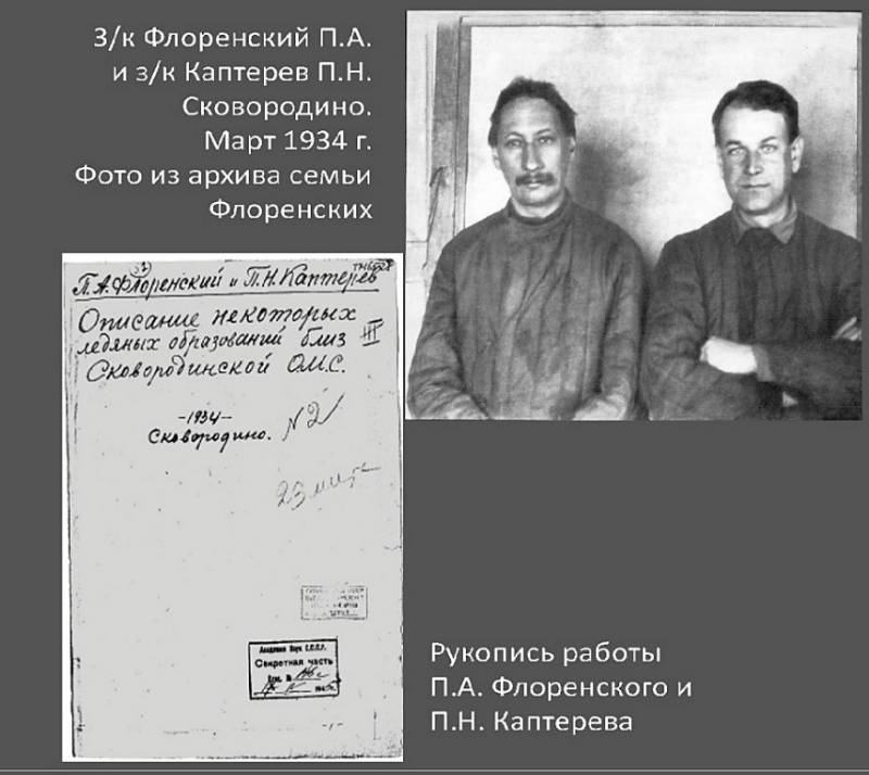 Постепенно новая и интересная работа захватывает его: «1934.II.12. … По-прежнему, …я погружен мыслями в мерзлоту … у меня с П. Н. происходят деятельные сборы и приготовления к поездке – переселению на мерзлотную станцию в Сковородино». Упомянутый в письме П. Н., это Каптеров Павел Николаевич, проходил по тому же делу, что и П.А. Флоренский, получил 5 лет ИТЛ, освобожден в январе 1936 г. Именно с ним он начал проводить исследования мерзлоты предварительно собрав: «… много материалов, относящихся к физике и, отчасти, геологии этих процессов. … Мне кажется, я уже разгадал механизм образования, так называемых, пучин, причем оказалось, что развиваемые в литературе взгляды неверны и, во всяком случае, существенно неполны».