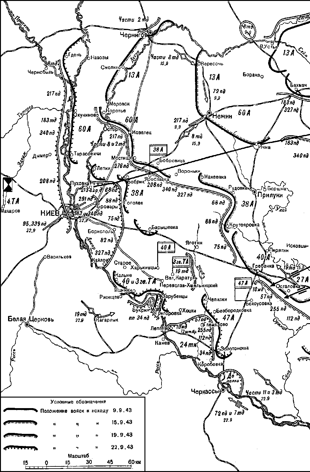 К 9–10 сентября войска правого крыла фронта подходили к реке Хорол и войска центра к реке Псел, т. е. находились в 190–240 км от Днепра.