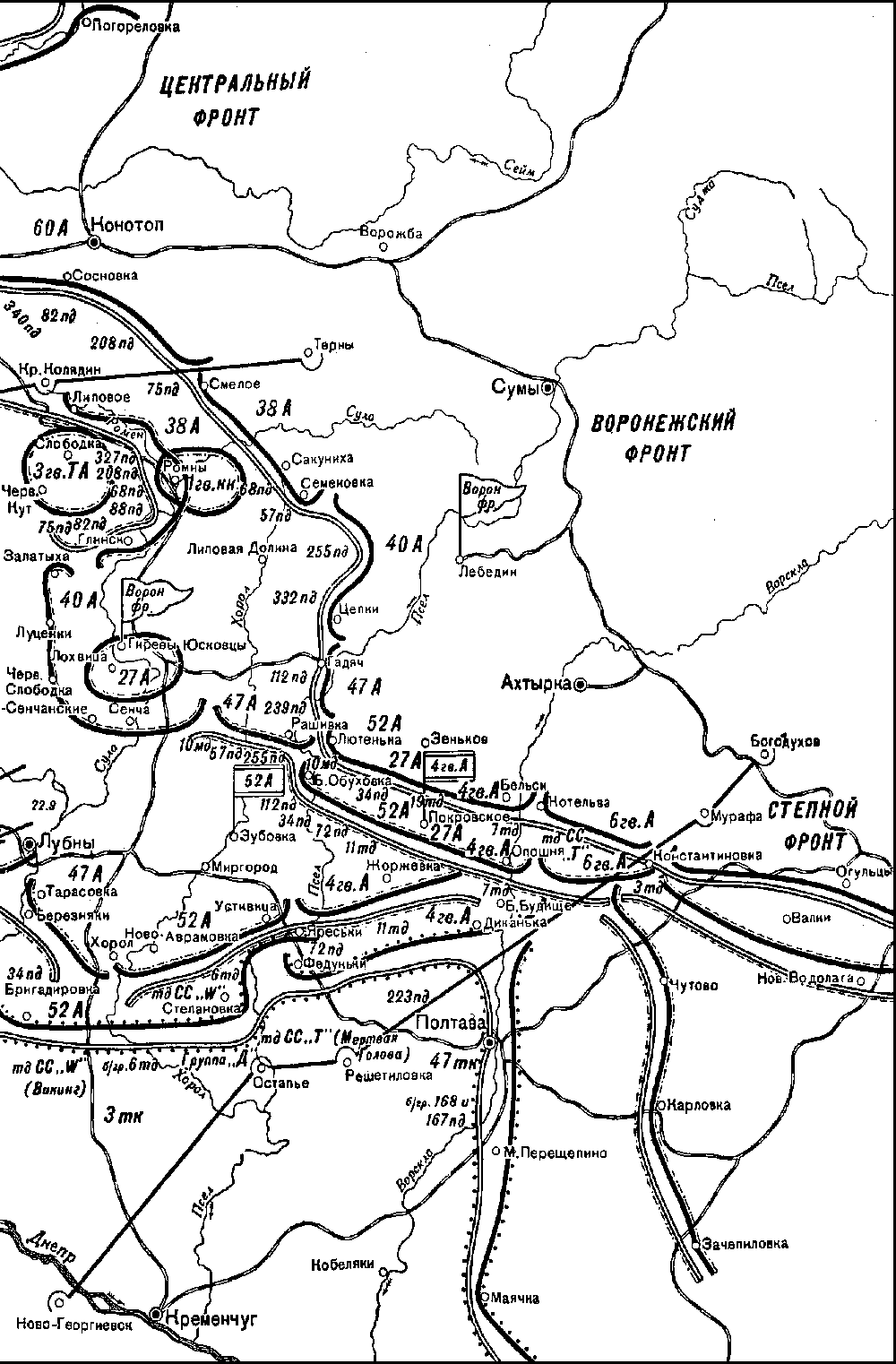 Группа армий правого крыла и центра Воронежского фронта (38, 40, 47 и 52-я армии), развивая наступление к Днепру, до 15 сентября вела бои с противником, пытавшимся сдержать наше наступление на выгодных для обороны рубежах, в частности на реки Псел, Хорол, Сула, Ромен[7].