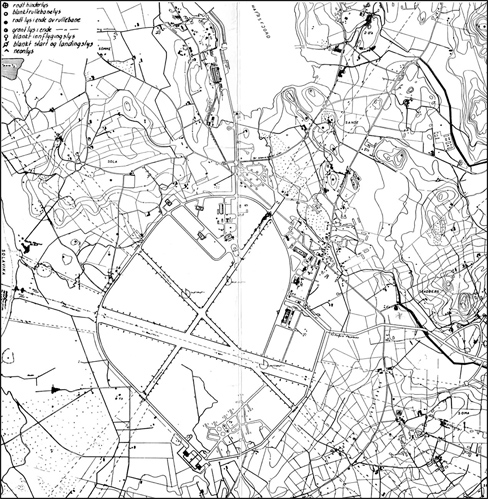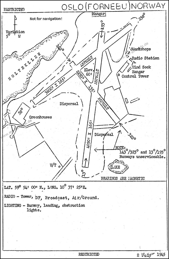 Аэродром Осло-Форнебю сразу после войны. На нем имеются три взлетно-посадочные полосы – две рабочие: большая, длиной 1097 и шириной 50 метров, и малая, длиной 686 и шириной 41 метр, а также одна необслуживаемая длиной 1234 и шириной 50 метров