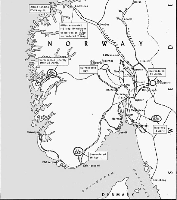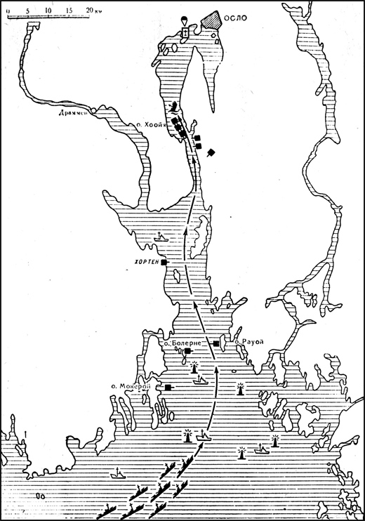 Тем временем Кригсмарине все еще пыталось занять норвежские укрепления на островах Осло-фьорда и по его берегам. Это удалось лишь вечером, после того как деморализованный событиями командующий укрепленным районом Осло-фьорда отдал приказ о капитуляции. Немецкие корабли вошли в гавань Осло лишь в 11:45 следующего дня – более чем на сутки позже, чем это предполагалось планом операции…