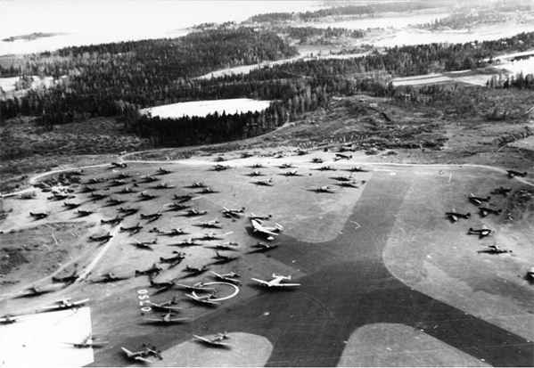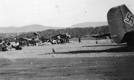 Аэродром Форнебю в апреле 1940 года, забитый немецкими самолетами. Видны большие пассажирские «Юнкерсы» G.38 и.Ju 90, транспортные Ju.52 и Ju.W34, а также бомбардировщики «Хейнкель» He.111