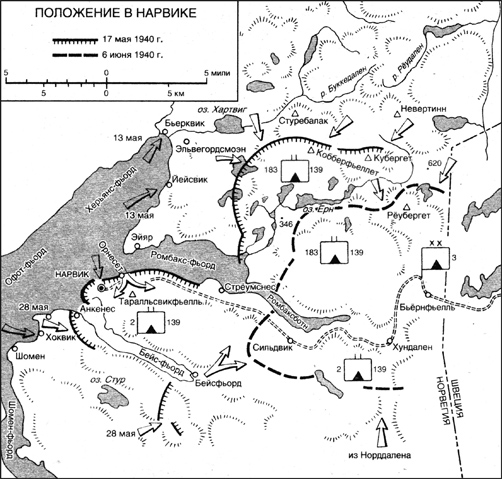 Тем не менее воздушные десантники все-таки приняли участие в боях за Нарвик – в качестве подкреплений действующим здесь горным егерям генерал-лейтенанта Дитля. Егеря, высадившиеся в Нарвике с эсминцев еще 9 апреля, были блокированы морским десантом союзников к востоку от Нарвика, прижаты к шведской границе и оказались в отчаянном положении.
