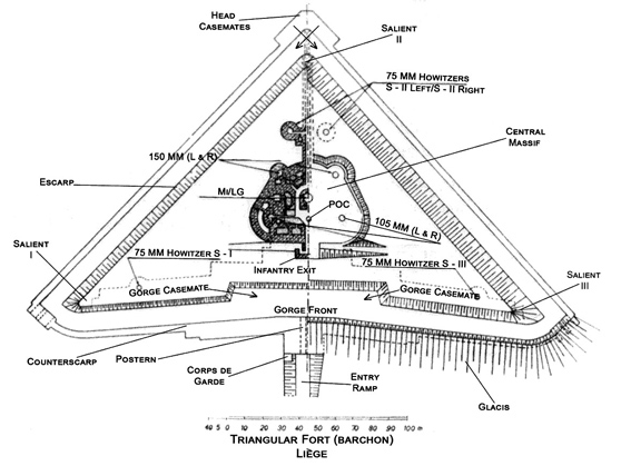 Кроме того, было модернизировано кольцо из 12 старых фортов вокруг самого Льежа, построенных еще в конце XIX века. В итоге с юга огневую поддержку Эбен-Эмаэлю могли оказать старые артиллерийские форты Понтисс и Баршон (по совокупности – два 150-мм, три 105-мм и восемь 75-мм орудий), с юго-востока – четыре 75-мм орудия нового форта Обин-Ньившато.
