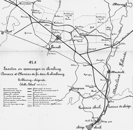 Варианты маршрута проектируемого Альберт-канала, 1922 год. Кружком обозначено место форта Эбен-Эмаэль