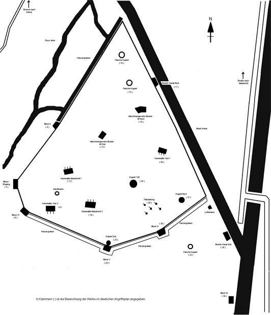 Схема форта Эбен-Эмаэль. Справа на востоке – река Маас, на северо-востоке – канал Альберта, проходящий в разрезе Кастер