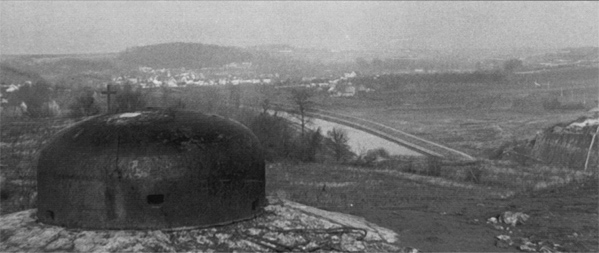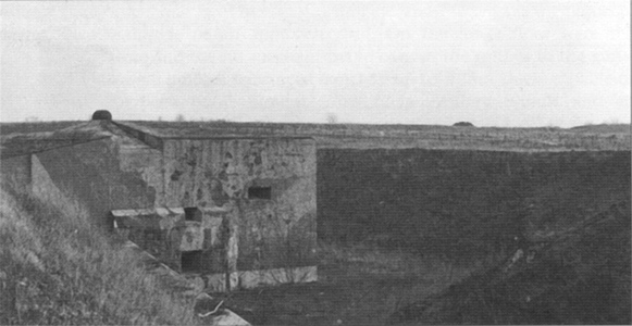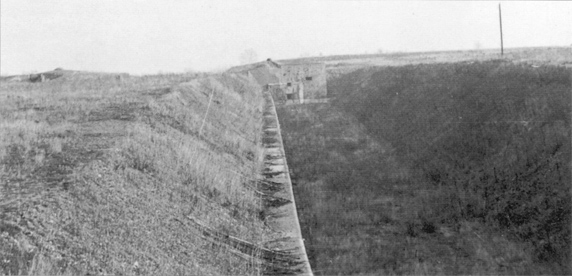 Противотанковый ров между Блоком IV и Блоком V (вид из последнего). Справа видна 75-мм башня «Купол Зюд»