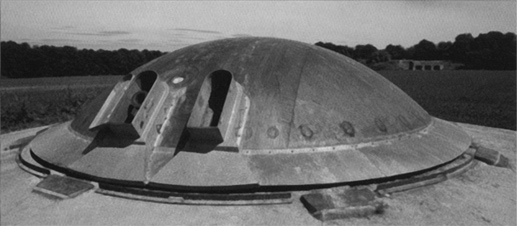 Полусферический купол имел диаметр 5,75 м, вес 230 тонн и мог вращаться на 360°. Общая толщина его защиты составляла 590 мм, из них 460 мм приходилось на два слоя броневой стали (внешний и внутренний), еще 80 мм – на два слоя конструкционной стали и еще 50 мм – на промежуточный слой войлока. В задней части купола располагалась труба для перископа, но к началу боевых действий он так и не был установлен.