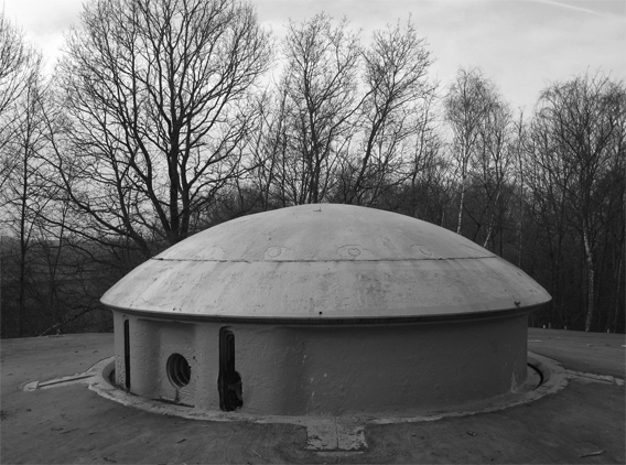 Наблюдательный купол «ЭБЕН-2» на крыше каземата «Ми-Норд». Вид на север, на заднем плане видны Альберт-канал и деревня Канне