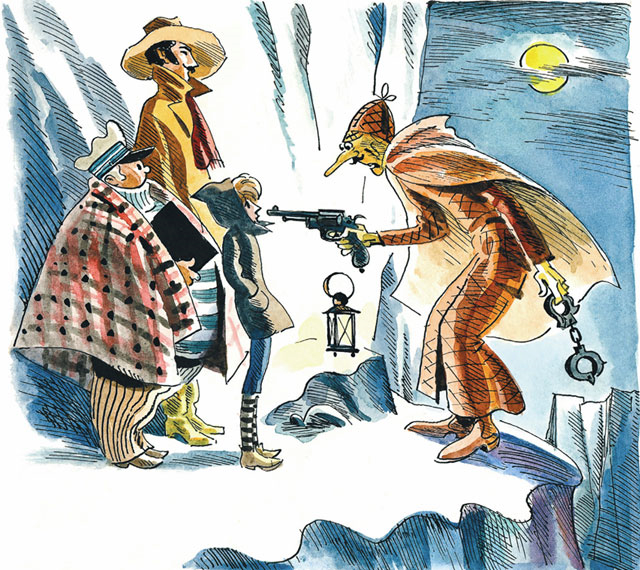 – А-а! – весело сказал сыщик Нус. – Наконец-то! Я продрог, ожидаючи вас на этой тропинке… Ай-ай-ай, мальчик совсем озяб! Ну ничего… – Он точным движением поставил фонарь на выступ скалы и достал из-за пазухи длинный пистолет. – Руки вверх, господа! И не надо делать глупостей. Если вы вздумаете бежать или сопротивляться, я могу нечаянно выстрелить в мальчика. Это будет крайне печально для всех нас. Вы ведь очень любите вашего племянника, папаша Юферс? Что касается меня, то я обожаю своего бывшего ученика, хотя между нами и были некоторые недоразумения…