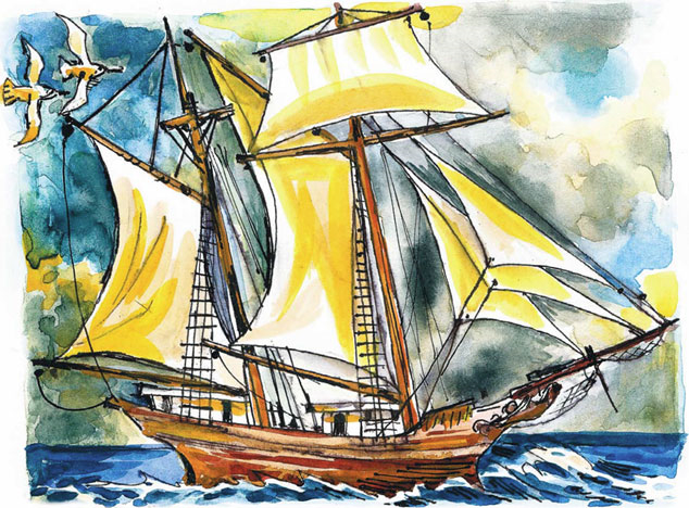 Он увидел высокое бледно-синее небо с клочьями серых и желтых облаков. Увидел мачты с круто выгнутыми гафельными парусами, с густой сеткой снастей. На передней мачте, над косым фока-триселем, надувалась и слегка дрожала тугая ткань поставленных на реях (как у бригов и фрегатов!) прямых парусов. Марсель и брамсель! На утреннем солнце ткань казалась желтоватой, с золотистым отливом. Над верхним реем, подрагивая крыльями в потоках воздуха и не отставая от шхуны, неслись две громадные чайки… Гвоздик задохнулся от тихого восторга.