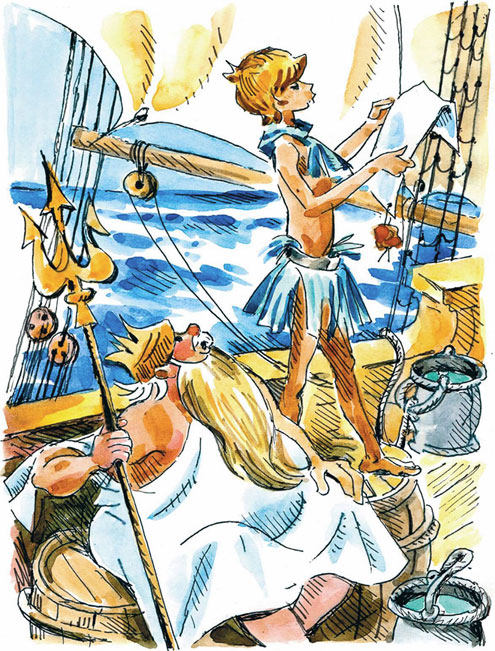 Совершенно некогда было скучать. С утра он помогал дядюшке Юферсу на камбузе, потом все по очереди учили юнгу матросским наукам. Боцман Том Бензель, добродушно ворча (не на Гвоздика, а на белый свет и на свой ревматизм), показывал морские узлы. Причем такие хитрые, каких не было и в Такелажном атласе Адмиралтейства. Научил даже, как вязать и (главное!) как развязывать «кукиш сатаны». При этом сказал только: «Смотри, чтобы не узнал наш храбрый Беппо…»
