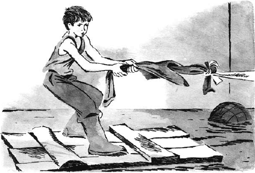 От удара и от тяжести край плота ушел на глубину. Вода залила валенки. Авария! Чтобы не было полной катастрофы, Павлик бросился с края на середину. Плот выпрямился и незаметно отошел от стены.