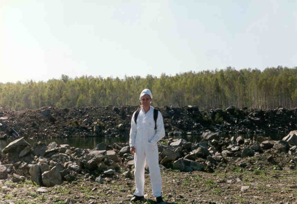 Владислав Ларин на берегу бывшего озера Карачйа («водоём 9»). За пару минут в этом месте человек получает пожизненную дозу облучения (май 1999)
