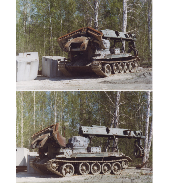 Эта машина со свинцовой защитой кабины водителя укладывает бетонный блоки на дно бывшего озера Карачай («водоём 9») (фото Владислава Ларина, май 1999 г.)