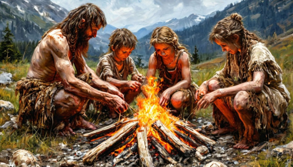 Иллюстрация: «Первобытные люди» в интерпретации искусственного интеллекта; наскальный рисунок.