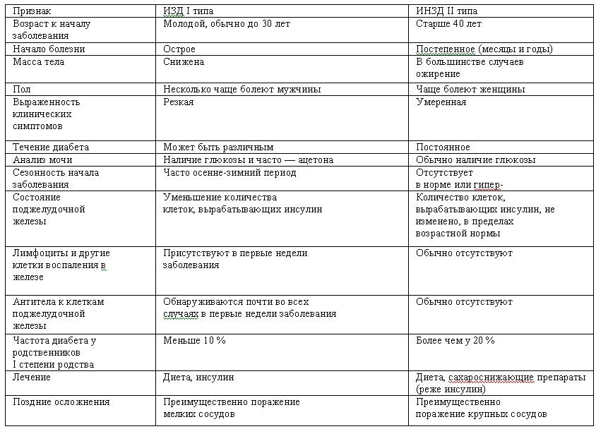 Инсулинонезависимым сахарным диабетом заболевают обычно люди старше 30 лет с избыточной массой тела (у них меньше проявлений сахарного диабета). Ацетон в моче у них может появляться только во время стресса. Хотя они и не нуждаются в уколах инсулина для выживания, им он может требоваться для контроля за уровнем сахара в крови. Фактором, который может вызвать развитие этого типа диабета, является переедание, приводящее к развитию ожирения, которое наблюдается у 80—90 % больных, страдающих ИНЗД. В таблице 1 представлены различия диабета I и II типа.