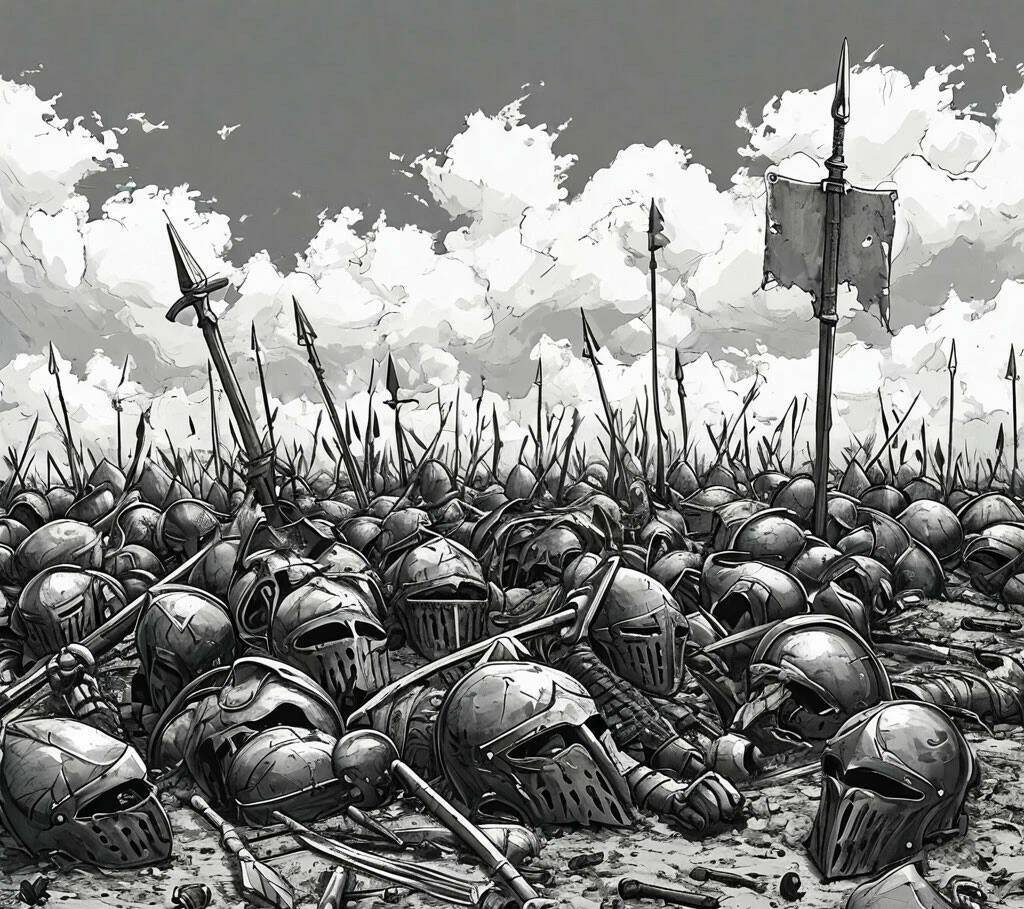 Невозможно представить, что же он чувствовал, потому что, вероятно, не чувствовал ничего. Словно из него выжгли всё, что могло жить, дышать, любить; вырвали с корнем любые остатки человеческого. Он опирался на ржавый, погнутый меч, выдернутый из окаменевшей руки умерщвлённого бандита, и не замечал, что каждый шаг был усилием его собственной воли, каждое движение теперь принадлежало ему. Он получил то, о чём мечтал, но обрел это в опустошённой и зловонной пустыне трупов. Из-за бликов серого неба казалось, что глаза убитых сверкали былой жизнью.
