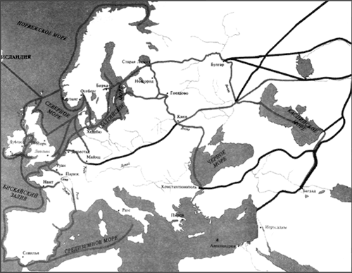 Рис. 1. Основные европейские пути сообщения. Установить марш руты викингов (на карте показаны черными линиями) помог анализ археологических находок – зарытых сокровищ и содержимого могильных курганов. На всем пространстве от Исландии до Ирана скандинавы выгодно обменивали драгоценные меха, моржовую кость, янтарь и многочисленных рабов на серебро, стекло, ткани и оружие. Жирным пунктиром показаны международные торговые пути[6]