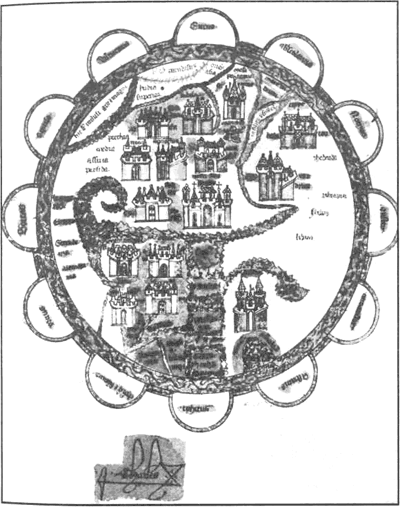 В «земле обетованной» растет древо познания добра и зла, отсюда берут начало четыре райские реки: Фисон (Ганг), Геон (Нил), Тигр и Евфрат. В пределах парадиза они скрыто текут под землей, выходя на поверхность вдали от чудесных истоков. Слева от рая картограф указал место, где Александр заточил мерзкие народы Гог и Магог. Города обозначены архитектурными символами. В Европе показаны Афины, Константинополь, Рим и Париж, в Азии – Иерусалим, Назарет, Дамаск, Антиохия, Троя, Мекка, Вавилон и Ниневия, в Египте – Александрия и Каир. Землю со всех сторон обтекает океан, четырем странам света соответствуют двенадцать ветров. На карте 1203 г., сохранившейся в Осме, в Старой Кастилии, изображены головы двенадцати апостолов, распределенных по всей поверхности земли. На многих картах эпохи крестовых походов рисовали Адама и Еву со змием.