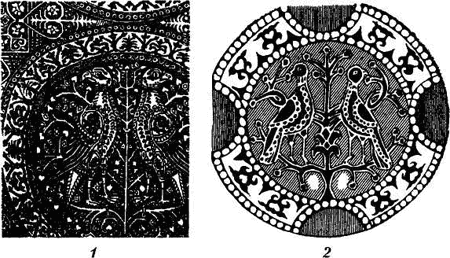 Рис. 59. Птицы: 1 – византийская ткань, XI-XII вв.; 2 – роспись смоленской церкви XII в. по мотивам византийского текстиля.