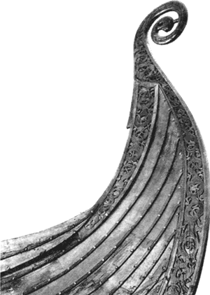 Рис. 12. Горделивый нос корабля викингов украшают изогнутая голова змеи и изящный резной орнамент из переплетающихся, злобно оскалившихся чудовищ От этих варварских узоров веет неистовой силой – яростные змеевидные драконы ожесточенно впиваются друг в друга Построенный между 800 и 850 гг, этот корабль, обнаруженный археологами в Осеберге неподалеку от Осло почти 100 лет назад, – самый красивый из всех найденных до сих пор кораблей викингов.[34]