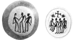 Рис. 15. Геммы-амулеты с изображением трех волхвов – покровителей путников (IX-X вв.): 1 – из раскопок в Смоленске, 2 из Ливерена (Нидерланды)