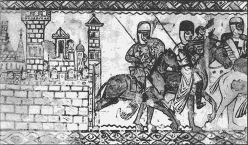 Рис. 16. Крестоносцы выезжают из ворот замка, чтобы вступить в битву с сарацинами. Фреска в часовне тамплиеров (1170–1180). Крессаке, деп. Шаранта[41]