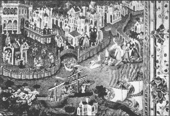 Рис. 17. Венеция – ворота на Восток. Миниатюра к оксфордской рукописи (около 1400 г.) сочинения Марко Поло изображает Венецию с ее торговыми судами, купеческой аристократией, нарядными домами на Пьяццетте. Слева на площади – колонна со львом св. Марка.[45]