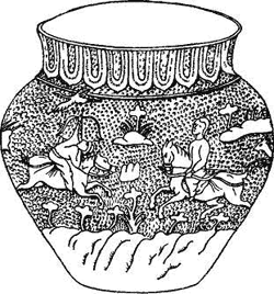 От Тараза и городов Восточного Туркестана отходили пути на Иртыш и к хакасам Верхнего Енисея, которые в VI в. создали сильное государство. Китайские авторы утверждают: хакасы поддерживали связи с Даши (арабами?), тибетцами и карлуками Семиречья. Каждые три года из Даши к ним направлялся караван верблюдов с узорчатыми шелками. По дороге, в земле карлуков, купцы получали военный конвой. В обмен на пушнину к хакасам Минусинской котловины – создателям своеобразного степного искусства – поступали такие диковинки, как произведения танских ювелиров. В курган близ Красноярска попал металлический сосуд, о котором упомянул Ф. Страленберг в своем труде «Историческое и географическое описание полуночной восточной части Европы и Азии», изданном в Любеке в 1730 г. (автор сочинения – шведский подполковник, участник похода Карла XII на Россию, взятый в плен под Полтавой, долго жил в Сибири). Выгравированные на сосуде охотничьи сцены и окружающий их ландшафт характерны для танской утвари (рис. 21).