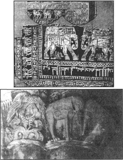 Рис. 22. Появление слонов в романской скульптуре связано с влиянием восточных шелков: 1 – среднеазиатская ткань Х в. с именем саманидского военачальника Бухтегина, 2 – капитель колонны церкви ев Петра в Ольнэ, деп Шаранта, Франция, первая половина XII в.[77]
