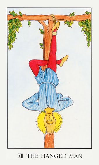 XIIДвенадцатый аркан Таро называется Повешенный (The Hanged Man) и изображает мужчину, висящего на голове вниз на дереве. Его ноги переплетены и он держит руки за спиной. Эта карта символизирует жертву, самопожертвование, принятие неизбежных изменений и переосмысление ситуации.