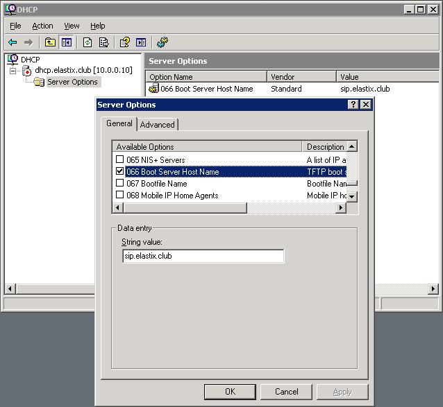 Поддерживающие Autoprovisioning SIP-телефоны умеют загружать свежие настройки при включении/перезагрузке или по расписанию. Можно вручную прописать на телефоне адрес сервера Elastix, но еще проще задействовать опцию 66 на сервере DHCP, в котором необходимо указать адрес сервера Elastix: