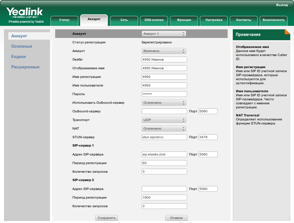 Наличие «SIP-сервер 2» позволяет реализовать простой способ переключения на резервную станцию Elastix, если основная станет недоступна. Логин и пароль на основной и резервной станциях должны совпадать.
