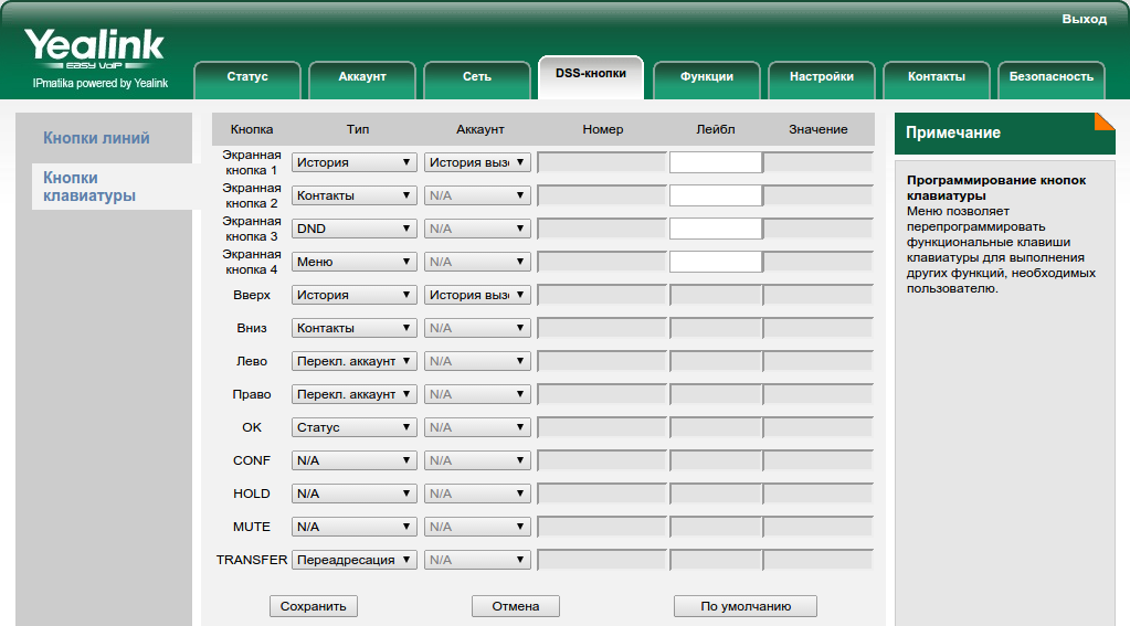 По умолчанию кнопки BLF запрограммированы на выбор Аккаунта 1 или 2. Однако, их можно настроить на другие функции. Для отображения статуса и для вызова часто требуемых абонентов можно установить следующие настройки:
