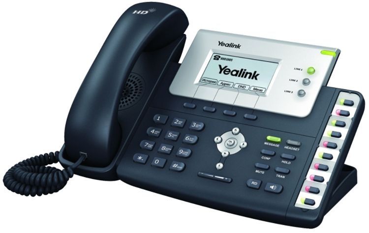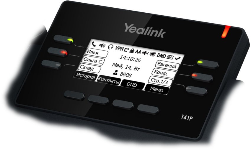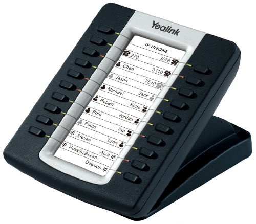 • Возможность подключения до 6 модулей дополнительных кнопок EXP38 (228 дополнительных кнопок BLF двухцветной индикации) или EXP39 (120 дополнительных кнопок BLF двухцветной индикации с ЖК дисплеем присвоенных имен, функция перелистывания позволяет запрограммировать быстрый доступ к 228 абонентам). Первые два модуля питаются от телефона, остальные – от блоков питания.