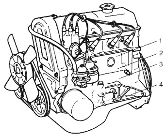 Рис. 3. Зоны прослушивания стуков в двигателе: 1 – стук пальцев; 2 – стук поршней; 3 – стук шатунных шеек коленчатого вала; 4 – стук коренных шеек коленчатого вала