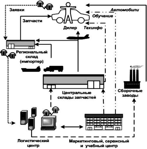 Так как дилеры и независимые мастерские ремонтируют 80~90 % парка машин, они являются мелкооптовыми заказчиками запасных частей, потребляющими основную массу товара. В этих условиях изучение спроса и планирование поставок запасных частей в регион облегчаются. Проблему соблюдения сроков поставок изготовители машин решают созданием региональных складов, обслуживающих дилеров на территориях, размеры которых или транспортные условия позволяют обеспечить доставку заказов дилерам автомобильным или железнодорожным транспортом в течение не более 12 ч. У компаний, реализующих множество моделей машин на больших территориях или во многих странах, например, “Ford”, вместо центрального склада или наряду с ним имеются зональные склады, которым поручено обслуживание только региональных складов. Управление запасами в системах складов осуществляется логистическим центром, это способствует сокращению запасов в системах.