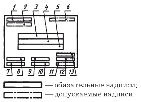 1 – манипуляционные знаки (предупредительные надписи); 2 – допускаемые предупредительные надписи; 3 — количество мест в партии, порядковый номер внутри партии; 4 – наименование грузополучателя и пункта назначения; 5 – наименование пункта перегрузки; 6 – надписи транспортных организаций; 7 – объем грузового места*; 8 — габаритные размеры грузового места; 9 – масса брутто; 10 – масса нетто; 11 — страна-изготовитель и (или) поставщик; 12 – наименование пункта отправления; 13 – наименование грузоотправителя