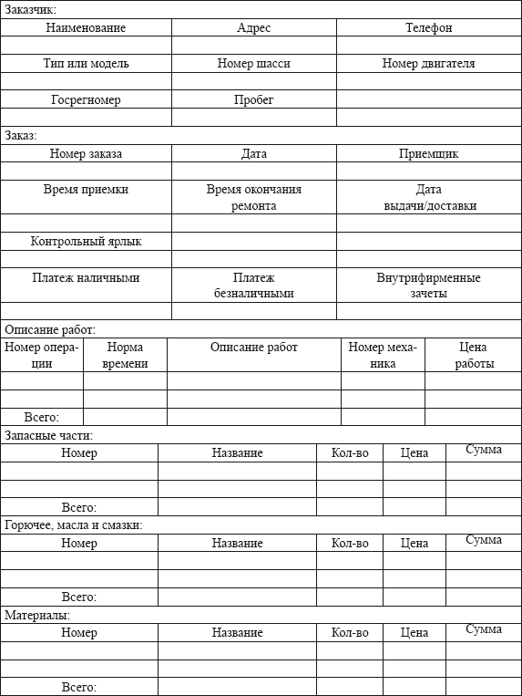 ♦ данные о клиенте, данные о машине, указания приемщика по ремонту, расценка ремонта, номер операции, норматив времени, ставки сдельные оплаты труда, перечень и стоимость необходимых запасных частей и материалов, стоимость ремонта узлов, переданных субподрядчику – соседней мастерской по пайке радиаторов и т. п., условия расчетов (наличные, безналичные, кредит и т. п.), подпись клиента.