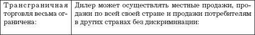 В ЕС закрепление за дилерами для торговли территорий, меньших, чем рынок Евросоюза, больше не разрешается, если это связано прямо или косвенно с ограничениями, например, квотами поставок. Если не связано, а речь идет лишь о зоне ответственности, определение территорий допускается.