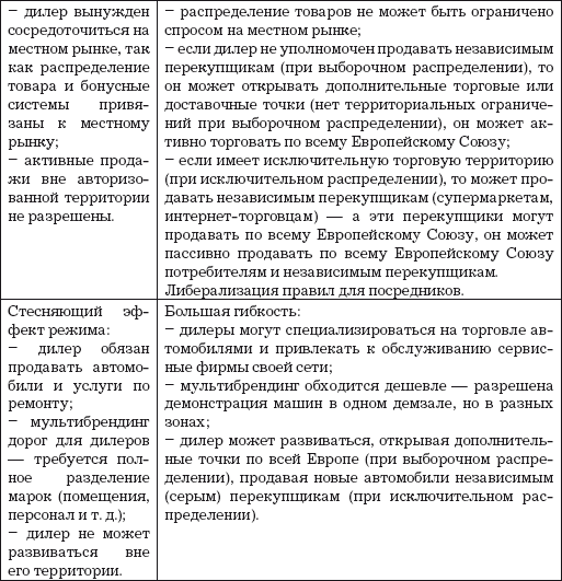 Дистрибьюторы в системе выборочного распределения имеют право вести активную продажу любому конечному пользователю, проживающему в любом регионе в пределах Европейского Сообщества, где используется выборочное распределение. Поставщикам, однако, разрешается налагать на дилера обязательство не продавать новые автомобили независимым перекупщикам в регионах, где используется выборочное распределение. Если в отдельных регионах Европейского Сообщества поставщик использует исключительное распределение, дилерам в системе исключительного распределения должно быть разрешено в рамках этих регионов вести пассивную продажу конечным пользователям или неуполномоченным торговцам. Если поставщик создает систему исключительного распределения, его дилеры должны свободно вести активную продажу в пределах их территории исключительного обслуживания или группе их исключительных заказчиков. В отношении всех других покупателей внутри системы исключительного распределения, являются ли они конечными пользователями или перекупщиками новых автотранспортных средств, они могут иметь возможность торговать ими пассивно. Если поставщик использует выборочное распределение в определенных других регионах Европейского Сообщества, дилерам в системе исключительного распределения должно быть разрешено вести активные продажи конечным пользователям и неуполномоченным торговцам в пределах этих регионов.