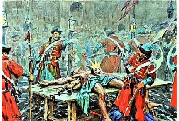 И тогда московский люд остервенело бросился терзать мёртвое тело государя Дмитрия Иоанновича! Его долго били ногами, секли мечами, кололи пиками. Насытившись бессмысленным поруганием, ещё вчера, казалось, всеми возлюбленного царя, его изуродованное тело бросили на стол у лобного места на Красной площади. На изувеченное лицо надели скоморошью маску, на грудь положили дудку, рядом волынку. Так потешались москвичи над любовью государя к иноземной музыке и веселью.