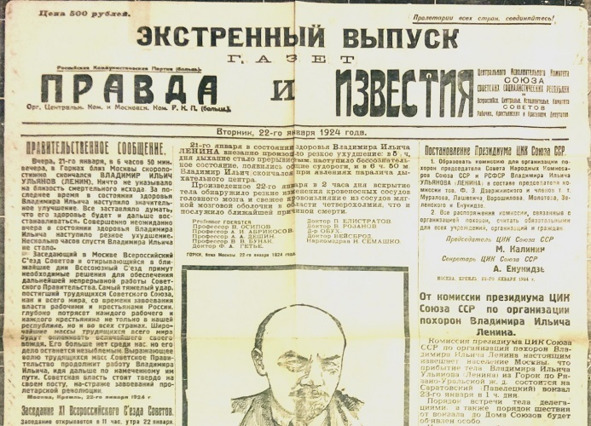 Дальше: ″Правительственное сообщение. Вчера 21 января в 6 часов 50 минут вечера в Горках близ Москвы скоропостижно скончался Владимир Ильич Ленин″!