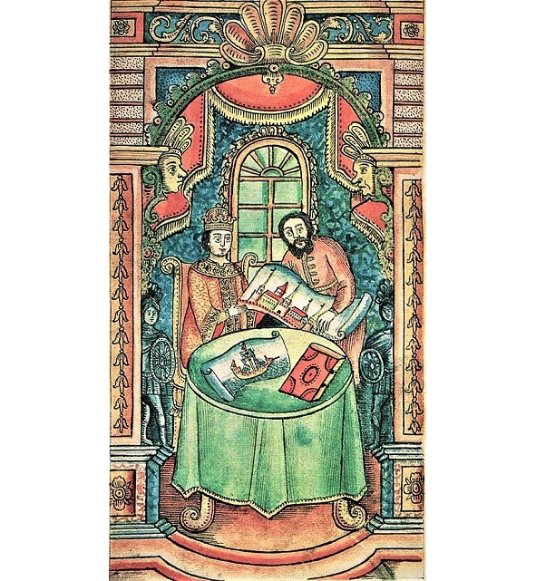 Царь Фёдор Алексеевич и Симеон Полоцкий экзаменуют Зотова. Миниатюра XVII в.