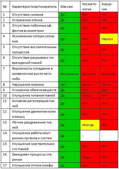 Ниже представлена сравнительная таблица массажа, косметологии и оперативного вмешательства в область лица и шеи.