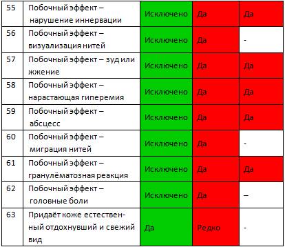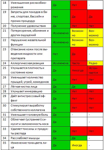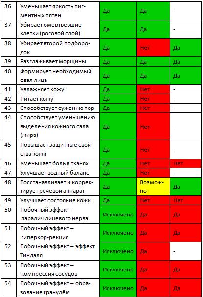 Далее рассмотрим в сравнительном соотношении разные варианты воздействия на ткани лица: последствия, вероятность возникновения отклонений и исход. Все они проявляются в большей или меньшей степени, что будет зависеть от опыта, возраста, образования мастера и индивидуальных особенностей организма людей.