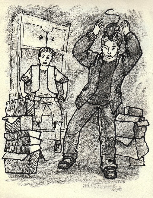 Тем временем мышей становилось все больше и больше, и вот уже их стало около сотни и они самоорганизовывались в квадраты, как настоящие боевые войска. А может быть это со страха показалась мальчишкам, боящимся сделать лишний шаг и наткнуться на нового врага. Внезапно на Вальку, нечаянно прислонившегося к коробке прыгнула крыса и вцепившись в его шею укусила его, оставив алый отпечаток выступившей крови. Капуста закричал и попытался сбросить серого пасюка, маша руками и крутя головой туда-сюда, но на помощь сородичу прибежали еще два бойца, и мальчишка не выдержав упал, повалив коробки и начал кататься по полу. Крысы разбежались, но попытались атаковать снова и тут пришел на помощь Мишка и даже смог уколоть одну из крыс своим маленьким клинком.