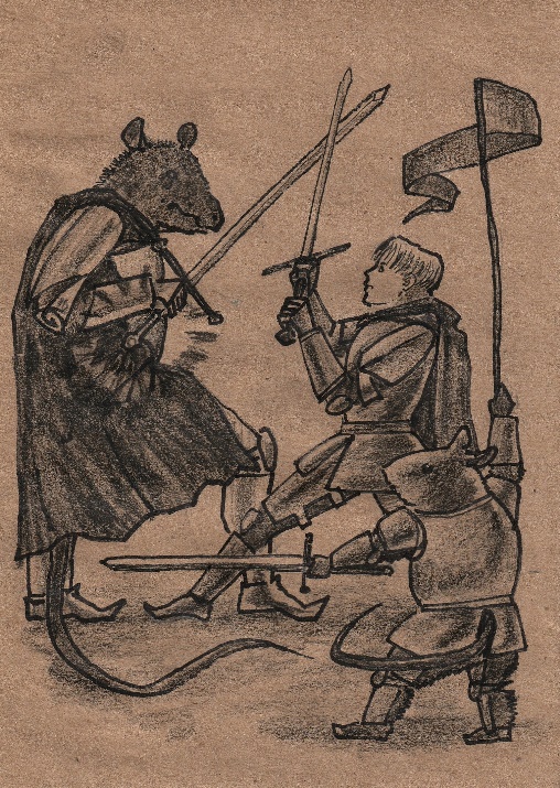 И вот, ряды крыс раздвигаются и вперед выходит Верховный Крысак, он машет мечом, словно приглашая Мишку схватиться с ним в честном бою. Они скрещивают клинки и начинается долгая изматывающая рубка, и не понятно кто сильнее, а кто слабее.